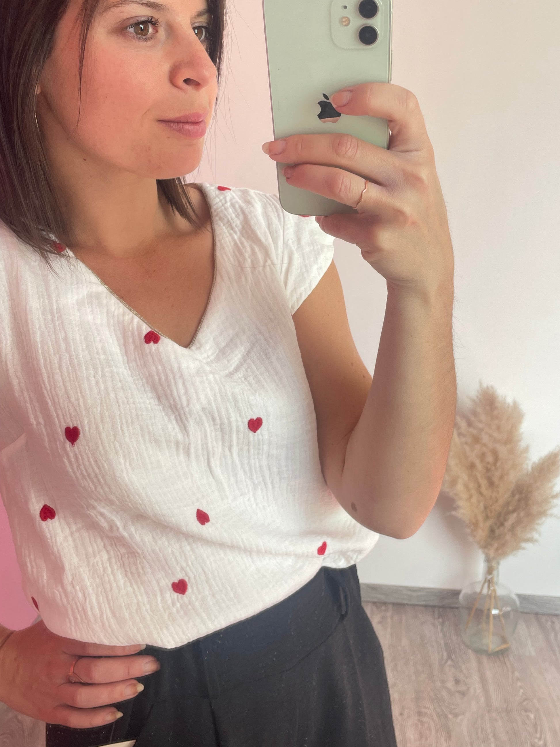 Un sublime top blanc avec ses petits cœurs rouges, signe de l'amour ♥